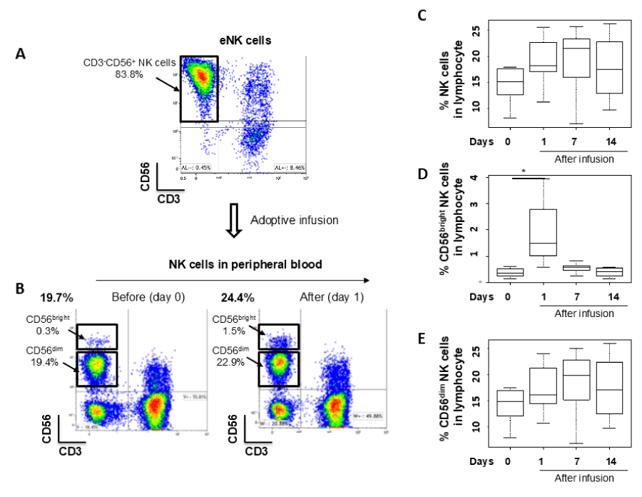 We aimed to determine whether the adoptive infusion of autologous eNK cells alters the proportion and subsets of NK cells in peripheral blood. Nine healthy subjects were enrolled in this study. The characteristics of the subjects and the phenotype of the adoptively infused eNK cells are summarized in table 1. On average, subjects received 3.4 × 10 9 (± 1.7 × 10 9 ) eNK cells, comprising 76.4% (± 17.1%) NK cells, as defined by the CD3 - CD56 + phenotype using FACS analysis. The remaining cell populations included 14.4% (± 14.2%) γδT cells (CD3 + Vγ9 + ) and 9.2% (± 5.8%) αβT cells (CD3 + Vγ9 - ), respectively. The infused eNK cells were enriched with CD3 - CD56 + NK cells and showed heightened CD56 expression (Figure 2A), with the CD56 bright NK cell phenotype representing the major cell population (Table 1). Following adoptive infusion, the overall NK cell proportion and subsets in peripheral blood increased (Figure 2B-2E). Specifically, the proportion of NK cells increased on days 1 and 7, with CD56 bright NK cells showing a significant increase on day 1 (Figure 2D) and CD56 dim NK cells showing a increased tendency on day 7 compared to baseline (day 0) (Figure 2E). The increase in CD56 bright NK cells was particularly pronounced on day 1 (Figure 2B,2D). By day 14, no significant changes were observed.These findings suggest that the adoptive infusion of eNK cells transiently increases the proportion of NK cells and alters their subsets in peripheral blood.