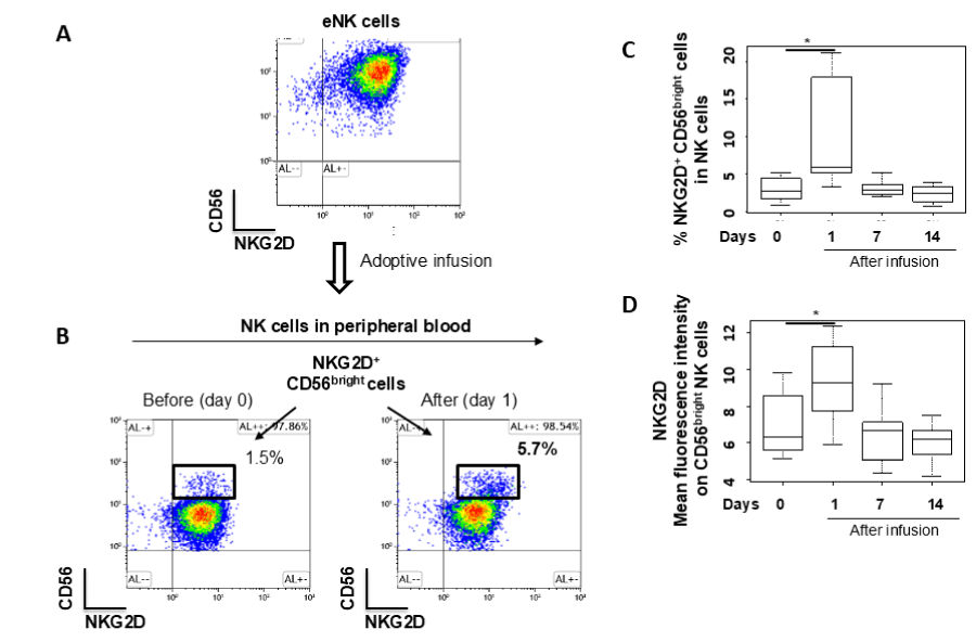 Figure 3: Adoptive Infusion of Autologous eNK Cells Increases NKG2D Expression on NK Cells in Peripheral Blood: (A) A representative flow cytometry CD56 vs. NKG2D density plot from CD3-CD56+ eNK cells. The eNK cells showed a heightened expression of NKG2D; (B) Representative flow cytometry CD56 vs. NKG2D density plots of NK cells in peripheral blood before (Day 0) and on Day 1 following adoptive infusion. NKG2D expression on CD56bright NK cells was significantly increased after the adoptive infusion; (C-D) The proportion of NKG2D+CD56bright NK cells in peripheral blood NK cells (C) and the mean fluorescence intensity of NKG2D on CD56bright NK cells (D) before (Day 0) and on Days 1, 7, and 14 following the infusion in nine healthy subjects. Significant differences are denoted by *p < 0.05 (Wilcoxon signed-rank test adjusted with the Holm method). If not indicated, results are not statistically significant.