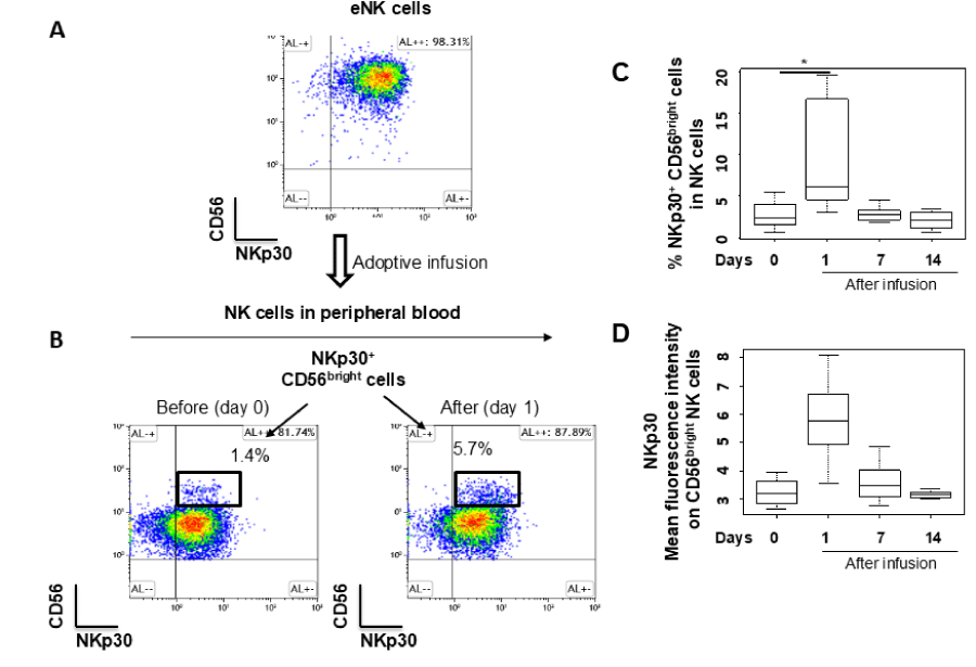 Figure 4: Adoptive Infusion of Autologous eNK Cells Enhances NKp30 Expression on NK Cells in Peripheral Blood: (A) A representative flow cytometry CD56 vs. NKp30 density plot of CD3-CD56+ eNK cells, demonstrating heightened expression of NKp30 in eNK cells; (B) Representative flow cytometry CD56 vs. NKp30 density plots of NK cells in peripheral blood before infusion (Day 0) and on Day 1 following adoptive infusion. NKp30 expression on CD56bright NK cells increased significantly after the infusion; (C-D) The proportion of NKp30+CD56bright NK cells among peripheral blood NK cells (C) and the mean fluorescence intensity (MFI) of NKp30 on CD56bright NK cells (D) were analyzed before infusion (Day 0) and on Days 1, 7, and 14 post-infusions in nine healthy subjects. Significant differences are indicated by *p < 0.05 (Wilcoxon signed-rank test adjusted with the Holm method). Where no notation is present, results are not statistically significant.