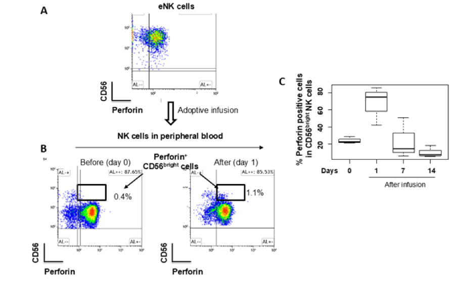 Figure 5: Adoptive Infusion of Autologous eNK Cells Increases Perforin Expression on NK Cells in Peripheral Blood: (A) A representative flow cytometry CD56 vs. perforin density plot of CD3-CD56+ eNK cells; (B) Representative flow cytometry CD56 vs. perforin density plots of NK cells in peripheral blood before infusion (Day 0) and on Day 1 following adoptive infusion. Perforin expression on CD56bright NK cells showed a marked increase tendency after the adoptive infusion; (C) The proportion of perforin+CD56bright NK cells among peripheral blood CD56bright NK cells was analyzed before infusion (Day 0) and on Days 1, 7, and 14 post-infusion in three healthy subjects.