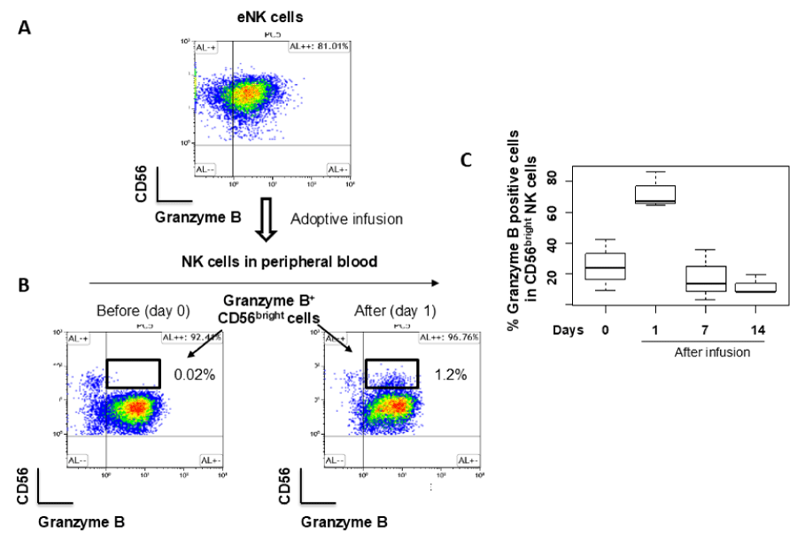 Figure 6: Adoptive Infusion of Autologous eNK Cells Increases Granzyme B Expression on NK Cells in Peripheral Blood: (A) A representative flow cytometry CD56 vs. Granzyme B density plot of CD3-CD56+ eNK cells; (B) Representative flow cytometry CD56 vs. Granzyme B density plots of NK cells in peripheral blood before infusion (Day 0) and on Day 1 following adoptive infusion. Granzyme B expression on CD56bright NK cells showed a marked increase tendency after the adoptive infusion; (C) The proportion of Granzyme B+CD56bright NK cells among peripheral blood CD56bright cells was analyzed before infusion (Day 0) and on Days 1, 7, and 14 post-infusion in three healthy subjects.