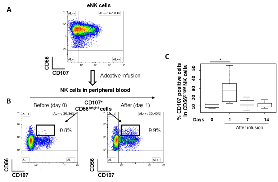 Figure 7: Adoptive Infusion of Autologous eNK Cells Increases CD107 Expression on NK Cells in Peripheral Blood: (A) A representative flow cytometry CD56 vs. CD107 density plot of CD3-CD56+ eNK cells after 4 hours of co-cultivation with K562 cells, showing heightened expression of CD107 in eNK cells; (B) Representative flow cytometry CD56 vs. CD107 density plots of NK cells in peripheral blood following co-cultivation before infusion (Day 0) and on Day 1 after adoptive infusion. CD107 expression on CD56bright NK cells increased obviously following the infusion; (C) The proportion of CD107+CD56bright NK cells among peripheral blood CD56bright NK cells was analyzed before infusion (Day 0) and on Days 1, 7, and 14 post-infusions in nine healthy subjects. Significant differences are indicated by *p < 0.05 (Wilcoxon signed-rank test adjusted with the Holm method). Where no notation is present, results are not statistically significant.