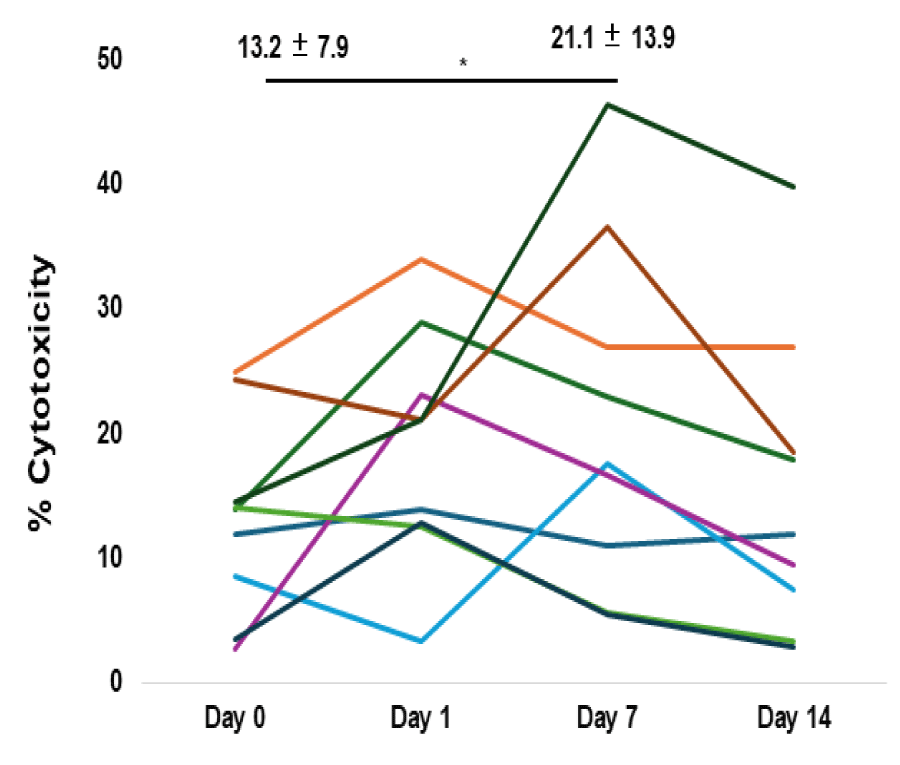 Figure 8: Adoptive Infusion of Autologous eNK Cells Increases the Cytotoxicity of PBMCs. The cytotoxicity of PBMCs against K562 cells was evaluated before infusion (Day 0) and on Days 1, 7, and 14 post-infusions in nine healthy subjects. The cytotoxicity was significantly increased on Day 7 compared to Day 0 (Wilcoxon signed-rank test adjusted with the Holm method). In contrast, results on Days 1 and 14 were not statistically s differences compared to Day 0.