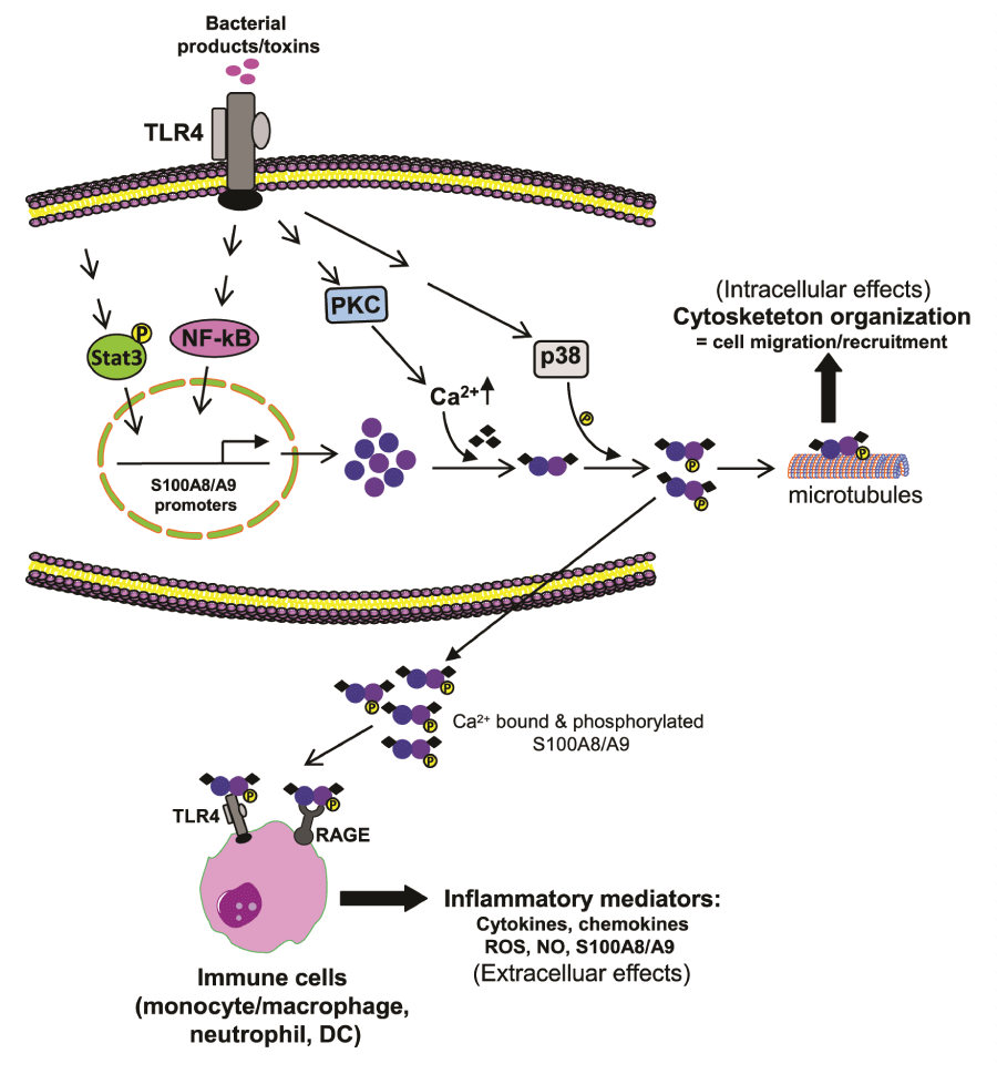 During infection, bacterial toxins activate TLR4 to induce S100A8/S100A9 expression in phagocytes. Protein kinase C increases Ca2+ levels, which dacilitates