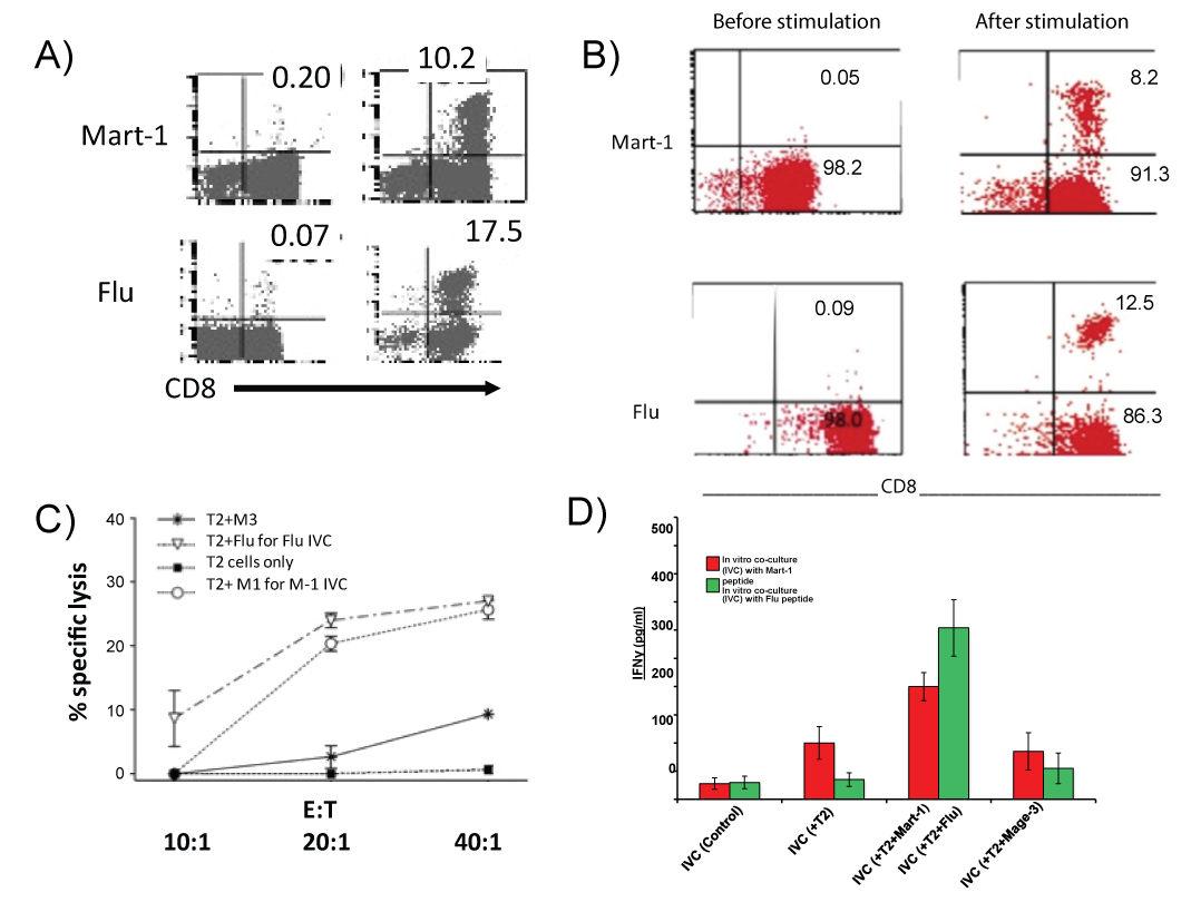 Figure 1: Expansion of Mart-1 and Flu antigen specific tetramer positive cells in IVCs with total PBL or purified CD8+ cells. Figure 1a = Mart-1 and Flu specific tetramer positive CD8+ cells from PBL IVC. Left panel shows baseline antigen specific cells: Top is Mart-1, bottom is Flu. Right panel shows expanded antigen specific cells: Top is Mart-1, bottom is Flu. Figure 1b = Mart-1 and Flu specific tetramer positive CD8+ cells in IVC with purified CD8+ cells. Left panel shows baseline antigen specific cells: Top is Mart-1, bottom is Flu. Right panel shows expanded antigen specific cells: top is Mart-1, bottom is Flu. Figure 1c = Specific cytotoxic effect of expanded CTL in IVCs. Assays were done in 51Chromium release using T2 cells pulsed with different peptides as target cells. M3, a nine amino acid peptide binding with A2 is used as control peptide. Figure 1d = Specificity in IFN-γ secretion by expanded CTL in IVCs as determined by ELISA with supernatant collected 24 h after re-stimulation of the expanded cells.