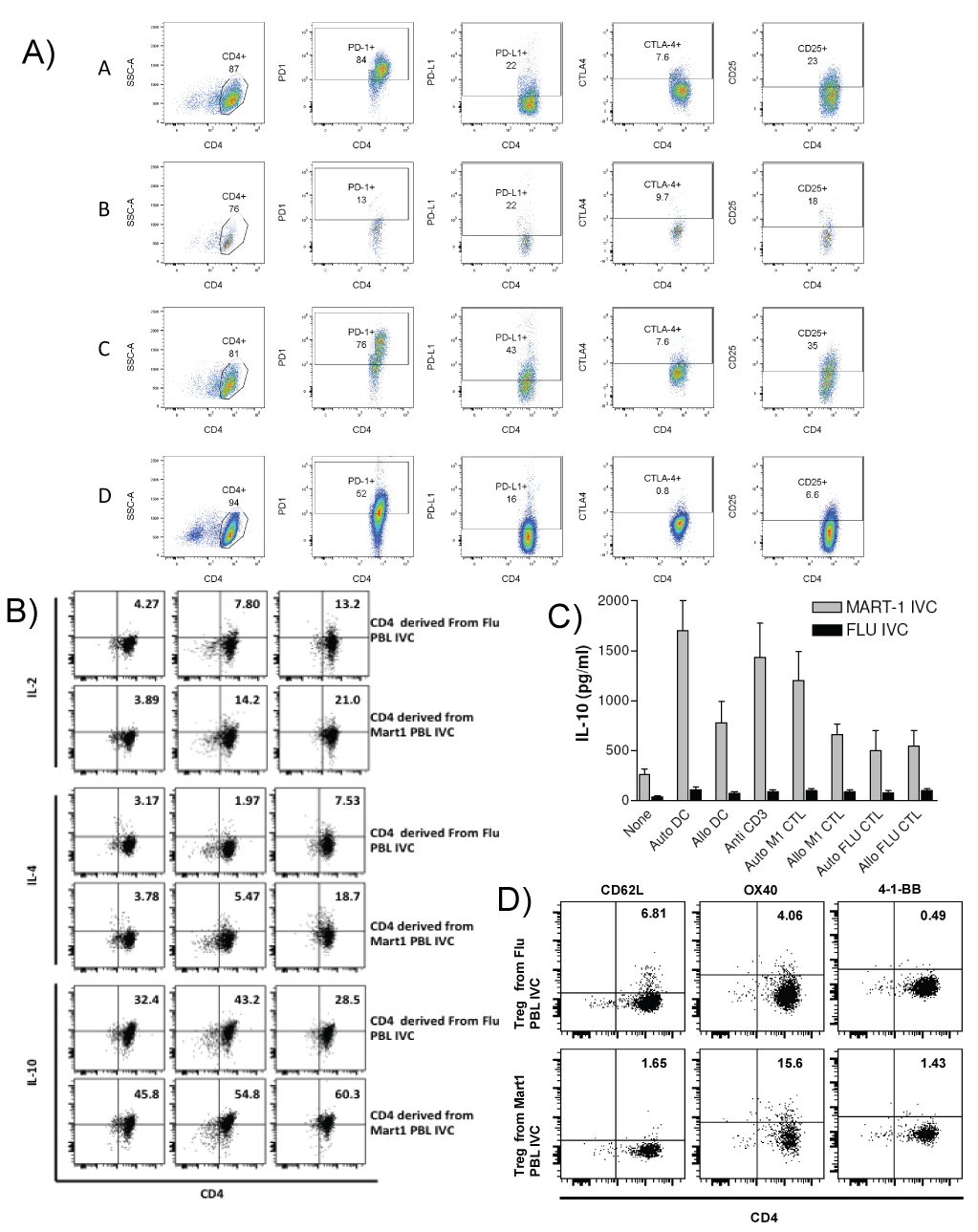Figure 2: Phenotypic and functional characterization of CD4+ cells isolated from Mart-1 and Flu PBL IVC. CD4+ cells were isolated from Mart-1 and Flu antigen specific PBL IVCs after 3rd stimulation. Phenotypic analysis of the purified CD4+ cells from PBL IVC were performed by staining these cells with CD4+, CD25 and Foxp3 and CD62L, OX40 and 4-1-BB. Figure 2a = Phenotypic analysis of CD4+ isolated from Mart-1 and Flu antigen stimulated PBL IVC. The different types of CD4+ Tregs are from different culture conditions as follows: A = CD4+CD25+ cells isolated from PBL IVC with Mart 1peptide pulsed auto- DC. B = CD4+CD25+ cells isolated from PBL IVC with Flu peptide pulsed auto-DC. C = CD4+CD25+ cells isolated from PBL IVC with autologous tumor D = CD4+CD25+ generated with purified CD4+CD25- cells in culture with anti CD3+anti CD28 +IL-2. Figure 2b = Intracellular cytokine production by Treg cells after stimulation with anti-CD3 antibody. Number of IL-2, IL-4 and IL-10 producing cells were analyzed by FACS. Figure 2c = Tregs from PBL IVCs A & B were further compared for level of IL-10 production after re-stimulation. Figure 2d = Comparative analysis of CD62L, OX and 41BB expression by two different Tregs isolated from PBL IVCs A &B.