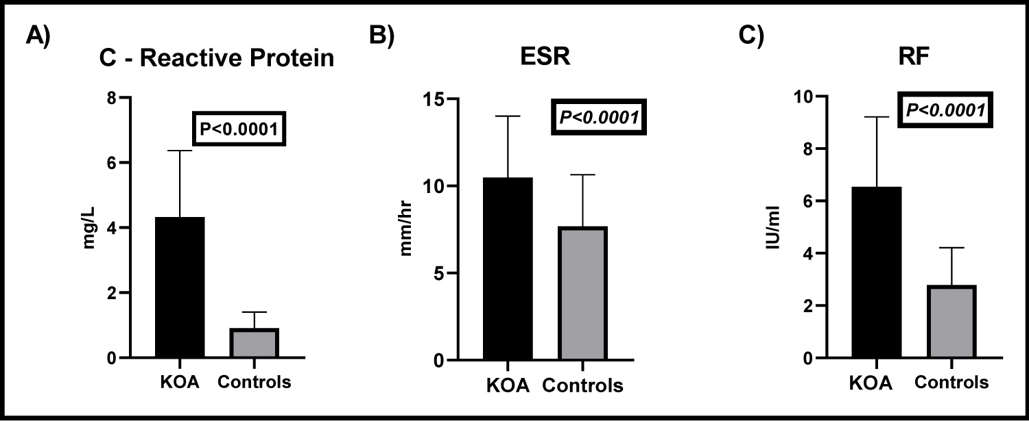 Figure 1: Estimation of the levels of CRP, ESR, and RF in patients with KOA and controls.