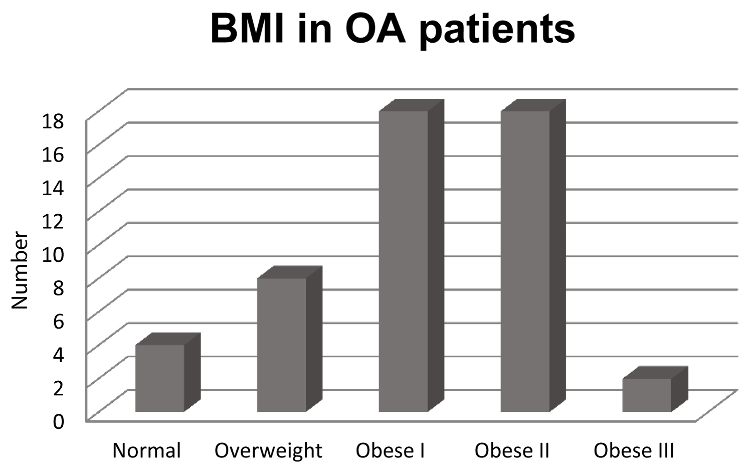 Assessment of BMI in the included patients of KOA showed that most of our included patients were suffering from obesity, Figure 2.
