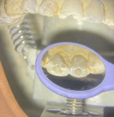 Each group of four teeth was embedded into a gypsum-based mold mixed with soft wood shavings (2:1 ratio of gypsum to shavings) to simulate trabecular bone radiographically. The molds were stabilized with a metal nut at the base to allow mounting on a simulated clinical phantom head. The roots were isolated with a thin layer of petroleum jelly to facilitate later removal from the mold.