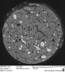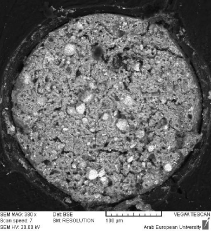 Figure 7: Cross-sectional SEM overview (× 441) of a canal obturated with bioceramic materials. Notably, the bioceramic putty and sealer phases exhibit different granular morphologies. Scale bar: 100 µm.