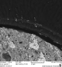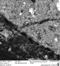 Figure 11: marginal gaps in Group 1. SEM image (× 1500) of a retrograde MTA sample from Group 1. Marginal gaps are clearly visible at the material-dentin interface, indicating incomplete adaptation despite ultrasonic preparation. Scale bar: 20 µm.