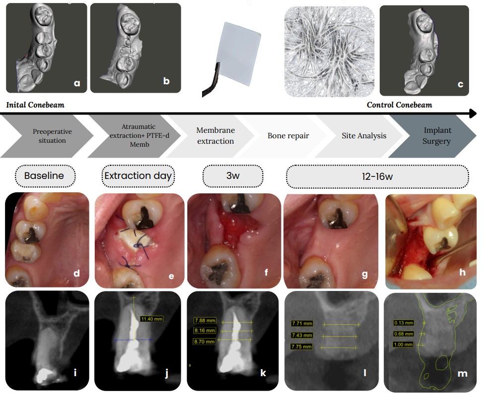 Figure 3: Clinical case follow up: (a) Initial STL scan; (b) STL scan showing placement of PTFE-d membrane; (c) STL scan at 12-week follow-up; (d) Initial intraoral photograph; (e) PTFE-d membrane placement; (f) Membrane removal at 21 days; (g) 12-week follow-up evaluation; (h) Alveolar ridge preserved at 12 weeks; (i) Initial CBCT showing cervical bone wall perforation; (j) Initial vertical bone dimensions on CBCT scan; (k) Initial horizontal bone dimensions on CBCT scan l) and m) CBCT at 12-week follow-up post-preservation.