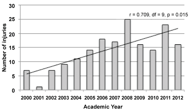 Figure 1: Number of student injuries by academic year. View Figure 1