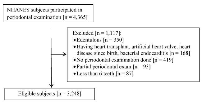 NHANES 2011-2012 is a representative sample of the U.S. population including 4,365 adults aged ≥ 30 years for periodontal examination. From the original dataset, we applied participant exclusion criteria as shown in figure 1. Subjects with less than six teeth were excluded as several PMPE protocols had missing values for these subjects. A total of 3,248 subjects met the inclusion criteria of the PMPE protocols.