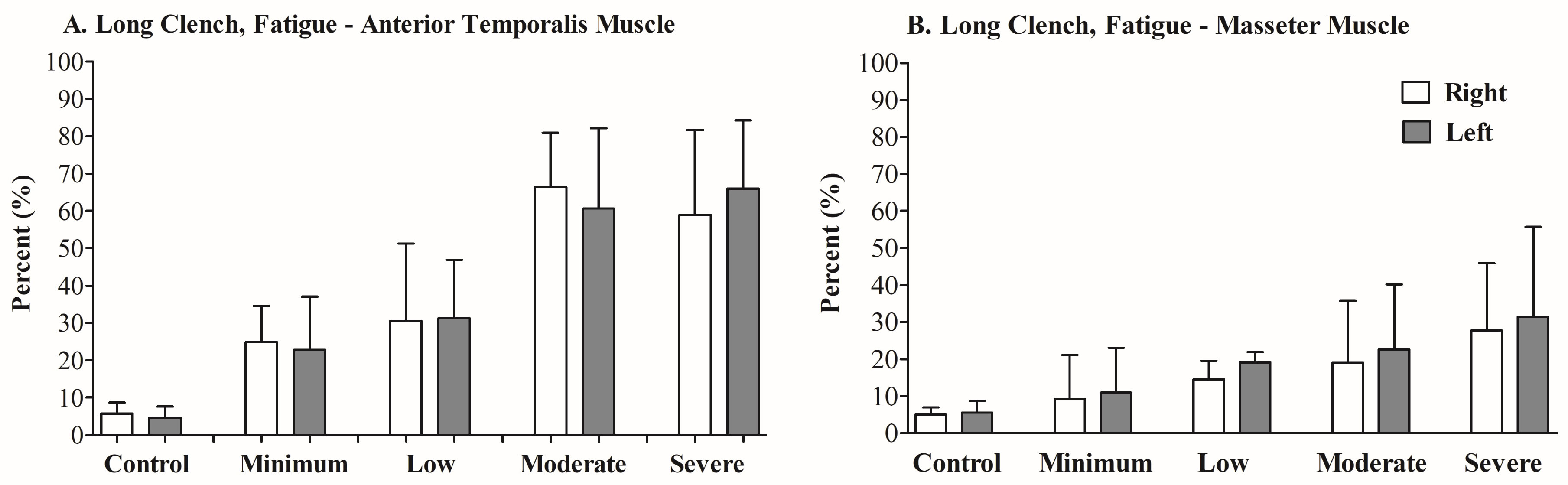 Figure 1: Long clench, fatigue of the anterior temporalis and masseter muscles (right and left sides) for the analyzed groups (control and anxiety levels-minimal, low, moderate and severe). Percentage of frequency variation (Hz) indicative of fatigue (%).