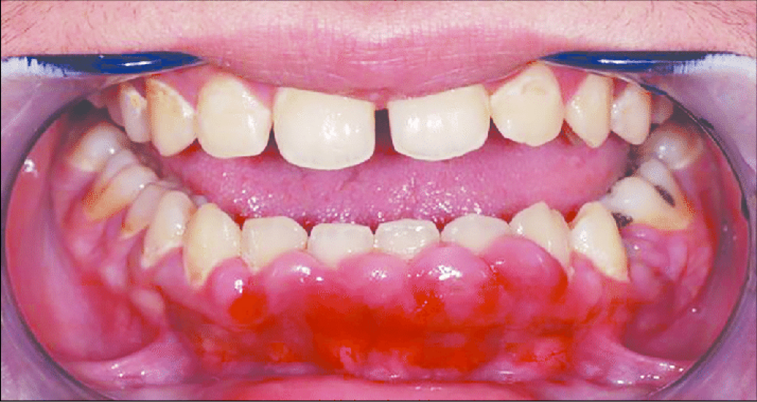Phenytoin is an anticonvulsant medication. It has been in use for about 80 years and it remains the main agent for the treatment of epilepsy up to this day, as well as being a useful agent in case of cardiac arrhythmias and several neuralgias [1]. It has been reported that 50% of Phenytoin recipients experience gingival hyperplasia. An even higher percentage is recorded among adolescents. The enlargement of the gingiva usually becomes noticeable within three months after the beginning of the treatment. In most cases, gingival hyperplasia caused by Phenytoin is not resolved with the cessation of treatment [2]. Hyperplastic gingiva as a result of Phenytoin usage can be seen in Figure 2. It has been suggested that the mechanism in which Phenytoin causes gingival overgrowth is by mast-cell mediated androgen stimulation of gingival fibroblasts. As a result of androgen stimulation, further expression of the enzyme 5α-reductase takes place within the cells. Findings of a study investigating the mechanisms of phenytoin-induced gingival hyperplasia have suggested that these responses, which take place in gingival fibroblasts, could be a reason to gingival enlargement [9].