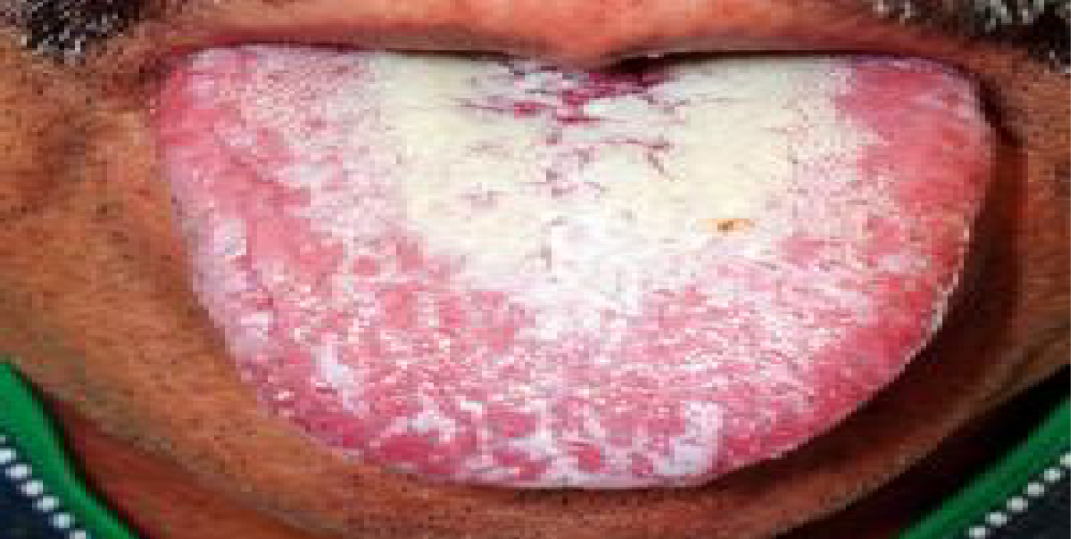 Figure 13: Oral candidiasis, white pseudo-membrane on the tongue.