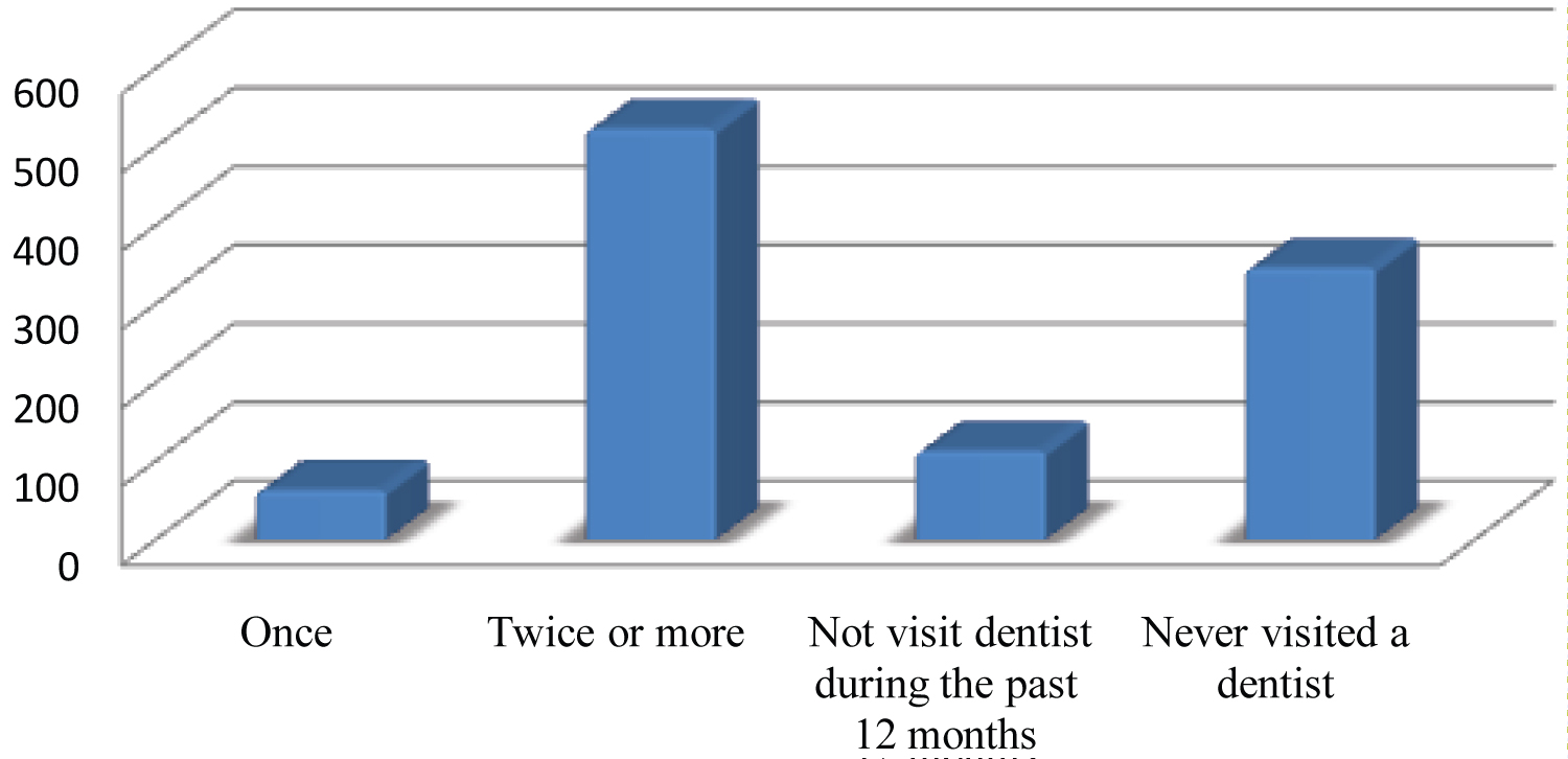 Frequency of dental visit of the participants: This study revealed that only 112 (19.5%) of the middle school children visited a dentist during the past twelve months; very few of them visited two times or more (8.5%) and saw once (11%). Besides, 114 (20%) didn't see a dentist in the past twelve months, whereas more than half (60.5%) never visited a dentist at all (Figure 6).