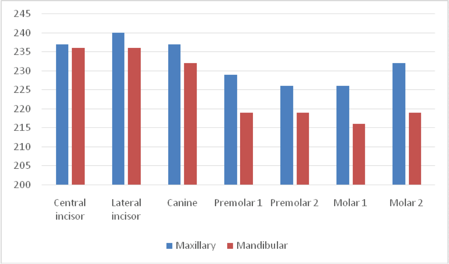 A total of 3204 teeth were assessed and considered healthy in the 120 patients. The graph shows the distribution according to the type of teeth and jaw. It can be seen that in our sample, maxillary teeth are more represented than mandibular teeth (Figure 1 and Figure 2).