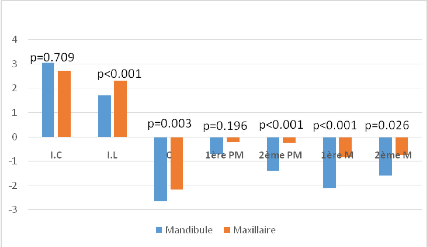 For our study population, the tooth types with the best stability were the canine, followed by the molars, the premolars and finally the incisors. This result is in line with the study by Hwang, et al. who found the same order of teeth for stability values [2]. However, it differs from Schulte, et al. who showed that the molars had the best stability, followed by the canines, then the premolars and finally the incisors [3]. The better stability of the canine could be explained by its large total root surface and its long coronal-radicular length. Furthermore, the leverage effect resulting from its crown-root ratio to the root is responsible for the lower Periotest values [15].