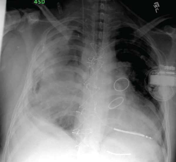Hemopneumothorax is also visible in the right lung, but it improved without evacuation four days later (Figure 3). After his right lung was recruited, he was changed back to a single lumen endotracheal tube, and managed with conventional mechanical ventilation. His respiratory status improved, but eventually developed further pulmonary hemorrhage, multiple organ failure and septic shock from coagulase negative staphylococcus infection.He eventually died of a recurrent massive pulmonary hemorrhage.