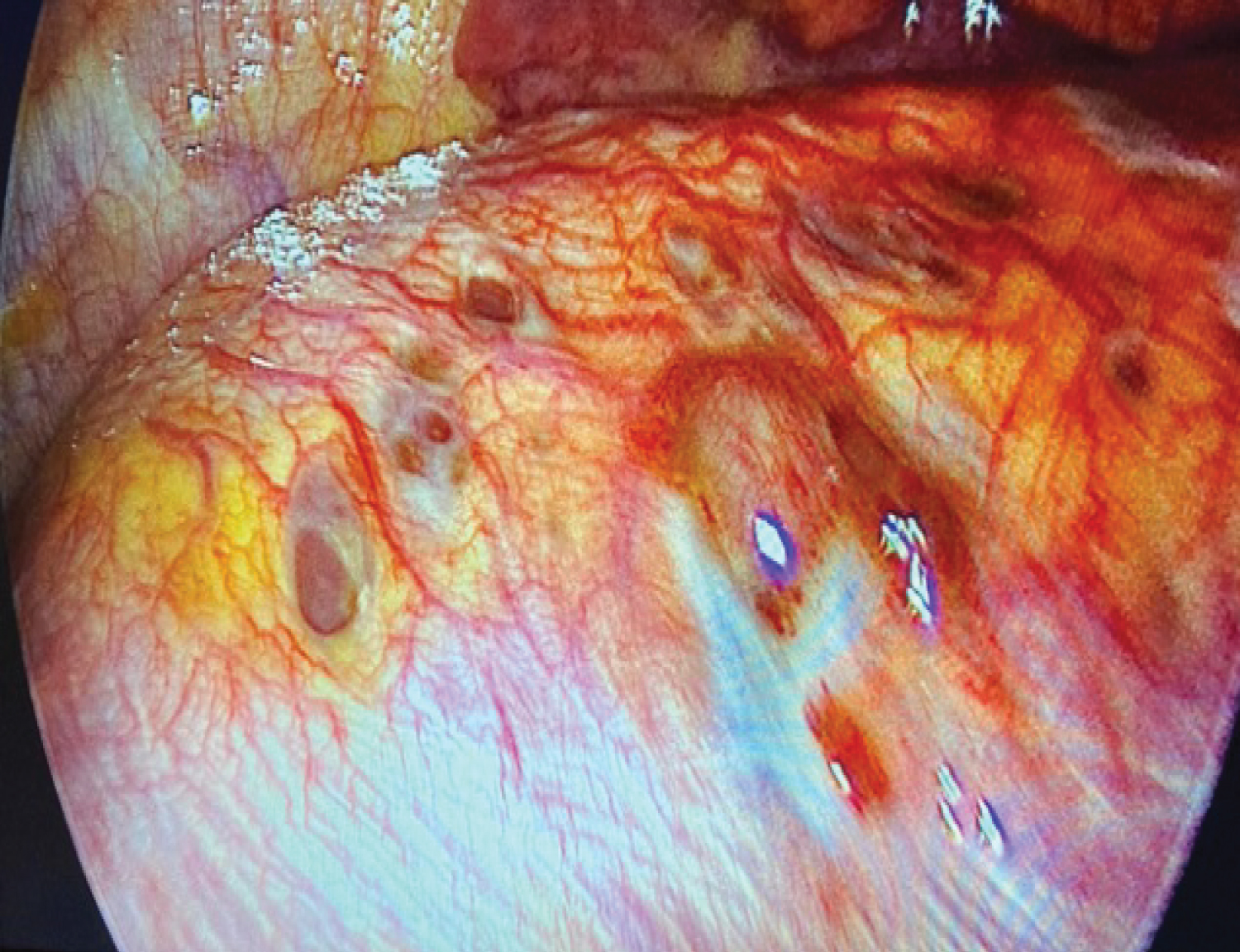 Figure 1: Intraoperative findings of the 2nd patient. Multiples diaphragmatic fenestrations. Liver can be seen underneath the perforations.