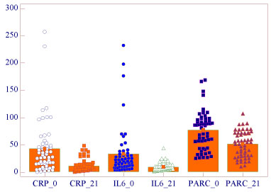 Mean concentration of serum markers studied were higher in first consultation of subjects for AECOPD and significantly decreasing after 21 days (P < 0.0001) respectively: IL60 33.46 pg/ml ± 45.9 (min 3.1 max 232.3), IL621 9.1 pg/ml ± 7.5 (min 1.7 max 43.6); PARC/CCL-180 77 ng/ml ± 34.5 (min 24.6 max 168.8), PARC/CCL-1821 51.2 ng/ml ± 23.5 (min 10.7 max 107.2); CRP0 43.1 mg/l ± 49.2 (min 0.2 max 257), CRP21 11.2 mg/l ± 12 (min 0.1 max 48). There were no correlations among these biomarkers with clinical variables (Figure 1).