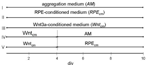 Figure 1: Schematic showing five different protocols for culturing dissociated cells from gerbil retina over a period of 10 days in vitro (div). Note that according to protocols IV and V, at div 4 Wntcm is replaced by aggregation medium (AM), or, by RPE supernatant (RPEcm), respectively. View Figure 1