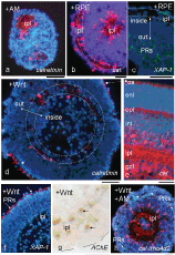 Figure 2: Distinct effects of treatment with Wnt3a (d, f, g) as compared with RPECM (b, c) on reaggregating cells from the perinatal Gerbil retina. In absence of both (a), in 10-days-old (10 div) spheroids, processes from circularly arranged calretinin+ amacrine cells (CR+ ACs; red) reach internally to form ipl-like neuropil spaces (see centres of a). In presence of RPECM (b; scheme II of Figure 1), a laminar ipl has formed near the sphere surface. XAP-1-stained PR precursors are located more to the center (c). In contrast, Wnt3a supplementation for 10 days (d, f, g; scheme III of Figure 1) induces a correct laminar inside-out polarity (double arrow in d; cf. with a section of a CR-stained P10 Gerbil retina in e). Compared with the control (a), DAPI in (d, f; blue) stains a compact ring of cells in the outer half sphere (note columnar arrangement of cells, dashed lines in f) with individual cells separating into a cell-free inner space (d, f). In (d) few CR+ ACs are arranged in an inner ring (dashed double line). In (f), XAP-1 staining reveals photoreceptor precursors correctly located along the sphere surface. Formation of PR outer segments is announced by CR staining (star in d; cf. [32]). AChE staining further supports the internal location of the ipl (g); some of these cells appear pair-wise (arrows). In (h; scheme IV of Figure 1), a shorter Wnt3a exposure of only 4 div still induced a correct laminar polarity, and allowed further sphere differentiation. Compared with (d, f, g), many more CR+ ACs extended their neurites into the ipl (red, dashed circle along inner ipl border); several PRs near the sphere surface are labelled by the rho4D2 antibody (green, arrows), where cell-free spaces announce formation of an opl (outer dashed line). Bars = 50 μm. View Figure 2
