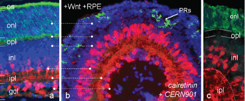 Figure 3: Optimal tissue formation after initial exposure to Wnt3a, followed by RPE supplementation (b; scheme V of Figure 1). After laminar polarity is established during 4 div in presence of Wnt3a, then RPECM for further 6 div promotes strongly the differentiation into a fully laminated spheroid resembling closely a normal Gerbil retina (a). Numerous CR+ ACs and their counterparts near the inner core send processes into the ipl, where they navigate laterally (red in b). Photoreceptors, as detected by CERN901 staining (green), are mostly correctly located outside of a cell-free opl-like ring (b, c). Their spatial organisation of 6-10 cell bodies within the onl and their degree of differentiation varies from spheroid to spheroid. Bar = 50 μm. View Figure 3