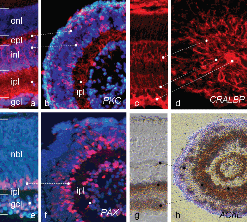 A further pronounced step of retinal tissue differentiation could be achieved under scheme V, e.g. 4 days treatment with Wnt3a to be followed by its replacement by RPE-conditioned medium (Figure 3b and Figure 3c). As a result, highly organised retinal spheres were produced at high rates, which presented all retinal layers, including a gcl, a wide ipl, an inl, an opl and an onl (Figure 3b and Figure 3c). These spheres resembled closely young developing mini-eyes, whereby the vitreous body was replaced in the centre of the spheres by a liquid-filled open space with a minor number of non-organised cells. A very high density of CR+ amacrine cells and cells of the gcl bordered a wide ipl, which was filled by their intermingling neuropil. A dual ipl sublamination, as being typical for the in vivo retina (Figure 2e, Figure 3a and Figure 3b), sometimes began to emerge. Rhodopsin or opsin expressing photoreceptors now had become numerous. Depending on the particular spheroid, they had not yet found their final position (Figure 3b), or, a complete onl began to form with many photoreceptors being neatly arranged (Figure 3c, green). Additional markers were used to characterise retinal cell types and layers within the spheroid. PKCá labels a subset of bipolar cells, with cell bodies being located in the outer half of the INL; their radially oriented processes reach from the opl towards two wide layers of the ipl (Figure 4a; [35]). This pattern was also detected in spheroids (Figure 4b); most but not all cell bodies were in the right place (some were found at the outer rim of the opl). Their processes were running in parallel (but not as regularly as in vivo) from the opl into the ipl, where they seemed to amass near the inner border (not indicating two separate sublaminae) next to the gcl. Next, Müller cells with their radial processes throughout the retina as detected by CRALBP (Figure 4c) were present in high numbers in this type of spheroids (Figure 4d). Overlapping with CR staining, a Pax6 antibody stained many cells of the gcl and the inner inl (Figure 4f). Their density appeared somewhat lower than in vivo (cf. Figure 4e). The histochemical staining for AChE (Figure 4h; cf. Figure 4g for in vivo retina) presented two neuropil sublaminae within the ipl and their stained cell bodies in inl and gcl. Moreover, strongly stained individual cells were regularly spaced next to the opl. They appeared to be horizontal cells (HCs), which are known to express AChE during development [36-38], but normally at a lower activity (see further Discussion).