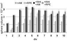 Figure 5: Spheroid volume growth under schemes I (AM control, light grey), II (RPECM, squared pattern), IV (WntCM + AM, black) and V (WntCM + RPECM, striped) is presented (since schemes III-V during the first 4 div are identical, scheme III is not shown). Note a strongly accelerated growth under WntCM treatment. Sphere diameters have been determined from 20 spheres/time point; the data set was analysed by students t-test (p ≤ 0.1; SD = 0.00065). View Figure 5