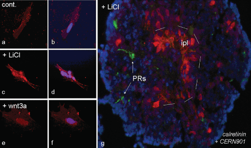 Figure 6: Both, Wnt3a and LiCl activate the canonical Wnt pathway in P1 Gerbil monolayer retinal cells (a-f), and in retinal 3D spheroids (g). Note translocation of β-catenin (red) into nucleus after Wnt3a (e, f) and LiCl treatment (c, d), while in control β-catenin remains outside of nucleus of retinal cells (a, b). In presence of LiCl, spheres grow very large with a structure similar to that of spheres treated with Wnt3a (scheme III of Figure 1), with an ipl forming inside (dashed line) and a few photoreceptors towards outside (green; cf. Figure 3). Bar in (a-f) = 12.5 μm, (g) = 25 μm. View Figure 6