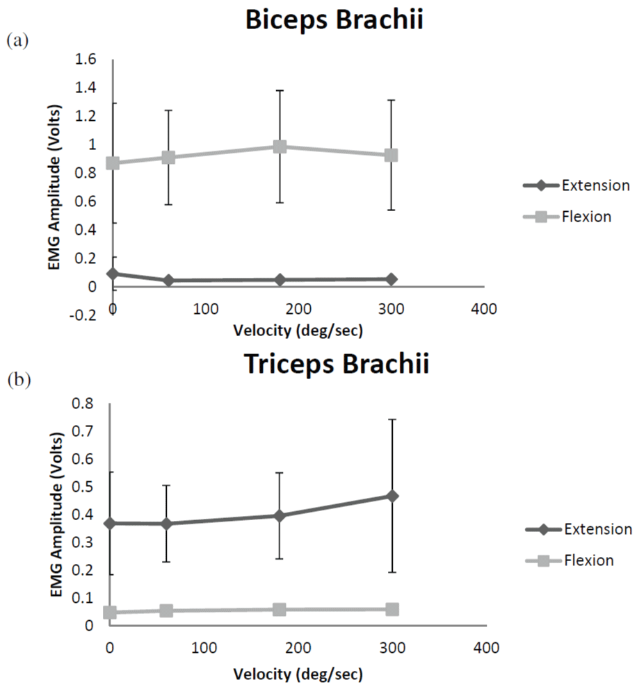 Figure 3: Electromyographic (EMG) amplitude for the biceps brachii (a) and