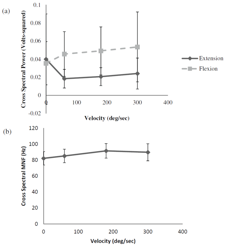 The results from the two-way repeated measures ANOVA for cross-spectral MNF indicated that there was no significant velocity × contraction type interaction (Figure 4b). There was also no significant main effect for contraction type, but there was a significant main effect for velocity. Follow-up analyses indicated that the marginal mean (collapsed across contraction types) cross-spectral MNF values increased with increases in velocity up to 180 degrees/second (Figure 4b).