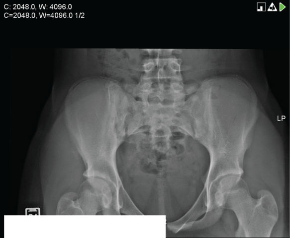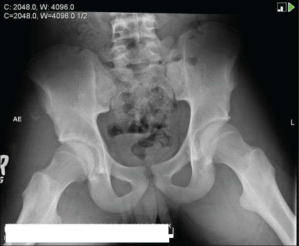 A 13 year-old female presented to the Emergency Department (ED) with a one-day history of right hip pain after participating in mosh pit activities. She denied any past medical history of right hip pain, direct trauma or fever. Vital signs were as follows: Temperature 36.88°C (98.4°F), heart rate 66 beats/minute, blood pressure 122/70mmHg, respiratory rate 18 breaths/minute and oxygen saturation 99% room air. In the ED she was limping. Physical examination revealed tenderness over the anterior iliac crest. Active range of motion of the right hip was limited due to pain. The remainder of the examination was unremarkable. A radiograph of her pelvis revealed an avulsion fracture of the right anterior superior iliac spine (Figure 1).