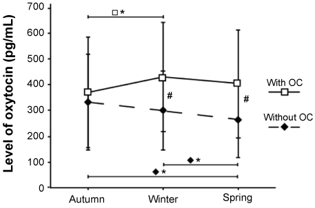 Figure 1: Average concentration of oxytocin levels in women with and without Oral Contraceptives (OC). In autumn, winter, and spring (mean ± 1SD). Statistically significant seasonal variations are shown in women with OC (□*p < 0.05) and woman without OC (♦*p < 0.05). Significant differences in oxytocin levels between the groups are shown (#p < 0.05). View Figure 1