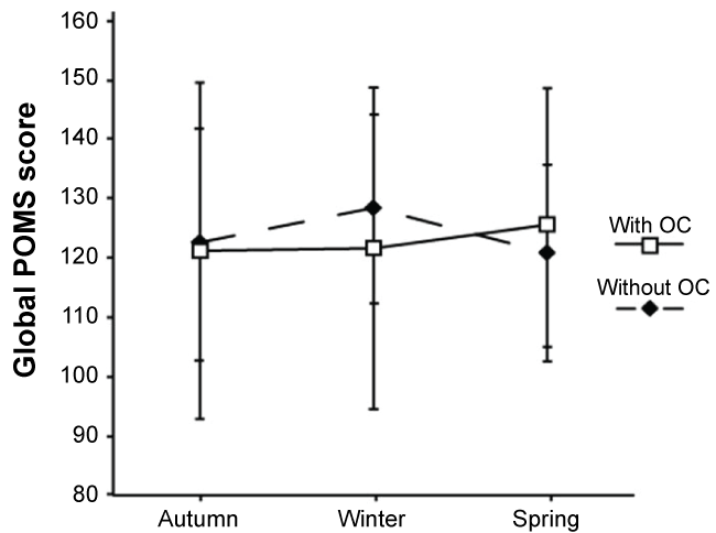 Figure 2: Average Global Profile of Mood States (Global POMS) score in women with and without Oral Contraceptives (OC). In autumn, winter, and spring (mean ± 1SD). No significant seasonal variation was found in Global POMS score within women with OC (□) and without OC (♦) and no significant differences in levels between the groups were detected. View Figure 2