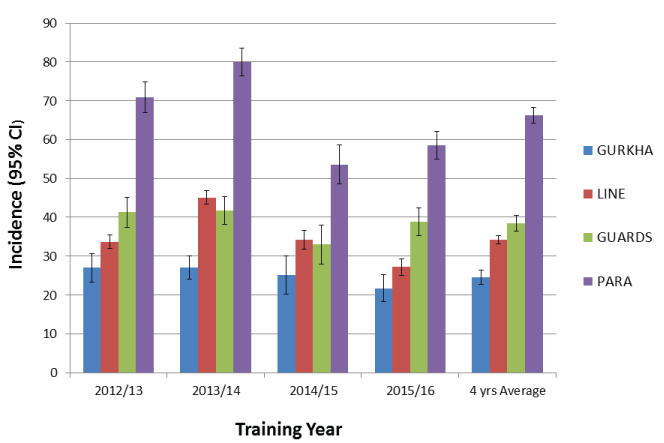 The overall four year average for regimental specific MSKI incidence rates ranged from 21.67 to 66.21%.The Parachute Regiment displayed both the highest incidence of injury (66.21%) and the lowest training outcome (38.63%) compared to a 98.76% first time pass out rate for Gurkha. The incidence of all MSKI across all CIC regiments is comparable to the ranges previously reported for other military training populations (20% to 60%) (8-10), as well as those published for civilian running populations (25 to 65%) [26] but are considerably lower than those reported for professional dancers 67 to 95% [27]. The Gurkha regiment reports the lowest four year average injury rate (21.67%) whilst the Parachute Regiment reports the highest (66.21%). A Study by Sharma, et al. [1] Previously reported an overall injury incidence of 48.6% in all British infantry recruits based on 2006-2008 data, whilst another study [5] in the same institution, based on 2009-2011 data, found an even higher injury incidence of 58%. However, although revealing, these studies did not investigate individual regimental specific injury incidence. Sharma and colleagues [2,3], the only previous review of CIC regimental injury incidence (JRAMC accepted for publication) described rate of incidence ranging from 10-86%.