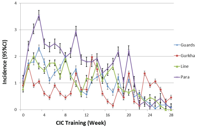 Figure 2: Incidence of injury encountered expressed in percentage with 95% CI at each week during training among four regiments. View Figure 2