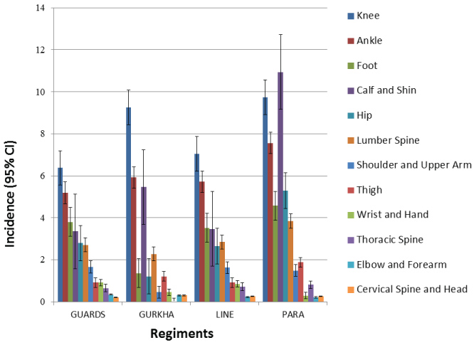 Lower limb MSKI have been most frequently reported [1,5-10]. Heir, et al. [8] Found 63% of injuries were sited on the lower limb, similarly Robinson, et al. [5] found 81% of MSKI reported by British Infantry recruits to be located in the lower limb whilst Almeida, et al. [9] reported a slightly higher rate, 82%, in American recruits. In contrast to the observations of Almeida, et al. [9] Who reported the majority of injuries to the ankle/foot region followed by the knee, this study found the highest injury occurred at the knee for CIC Guards, Gurkha and Line, with the ankle as second most prevalent site for all. The parachute regiment, however, most frequently reported injuries to the shin and calf followed then by the knee. The findings from this study are comparable to those reported elsewhere in the literature [1,15].