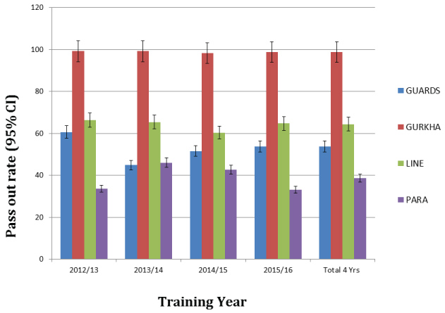 Training outcome, when described as the number of recruits successfully completing both phase 1 & phase 2 on the first attempt, was observed to vary year on year. The average pass out rate taken over the four consecutive years, for recruits completing training at the first attempt differed between regiments; 98.76% (Gurkha), 64.47% (Line), 53.78% (Guards), and 38.63% (Para) (Figure 5).