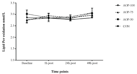 Figure 1: Comparison of lipid peroxide levels (nmol/L) at rest, 1 h, 24 h, and 48 h after resistance exercise performed at different levels of AOP (n = 12). CON: Control condition with no occlusion; AOP-50: Experimental condition at 50% of Arterial Occlusion Pressure; AOP-75: Experimental condition at 75% of Arterial Occlusion Pressure; AOP-100: Experimental condition at 100% of Arterial Occlusion Pressure. View Figure 1