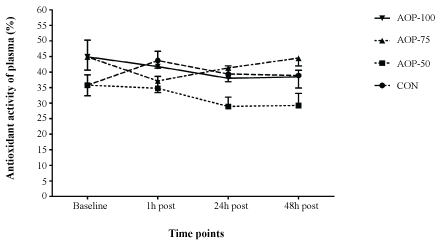Figure 2: Comparison of the antioxidant activity of plasma (%) at rest, 1 h, 24 h, and 48 h after resistance exercise performed at different levels of AOP (n = 12). CON: Control condition with no occlusion; AOP-50: Experimental condition at 50% of Arterial Occlusion Pressure; AOP-75: Experimental condition at 75% of Arterial Occlusion Pressure; AOP-100: Experimental condition at 100% of Arterial Occlusion Pressure. View Figure 2