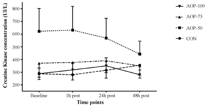 Figure 4: Comparison of creatine kinase concentrations at rest, 1 h, 24 h, and 48 h post-resistance exercise performed at different levels of AOP (n = 12). CON: Control condition with no occlusion; AOP-50: Experimental condition at 50% of Arterial Occlusion Pressure; AOP-75: Experimental condition at 75% of Arterial Occlusion Pressure; AOP-100: Experimental condition at 100% of Arterial Occlusion Pressure. View Figure 4