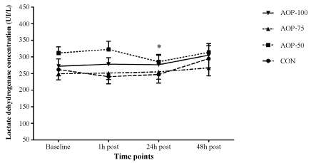Figure 4 presents the serum levels of CK. There was no significant condition (F = 2.63, p = 0.07) or time (F = 1.25, p = 0.31) main effects and no significant condition by time interaction (F = 1.22, p = 0.29). For plasma levels of LDH (Figure 5), the main effect of condition was not significant (F = 1.10, p = 0.12) and there was no significant condition by time interaction (F = 0.98, p = 0.46). However, there was a significant time main effect (F = 3.29, p = 0.048), in which plasma levels of LDH were significant lower (p < 0.01) 24 h post-exercise (265.83 ± 17.55 UI/L) compared to 48 h post-exercise (294.96 ± 17.51 UI/L).