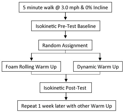 Differences between the pre-test and post-test measures on the dependent variables of average torque, peak torque, total work and average power were recorded. The two independent variables included a foam rolling protocol versus a traditional active warm-up protocol. The testing days were one week apart with each session occurring at approximately the same time of day.