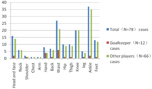 Futsal belongs to a whole-body contact sport of technical confrontation. Due to small site and strong confrontation, players are asked to accomplish technical movements at a high speed while changing body positions. Muscle injuries are easy to occur upon any poor preparation of technical actions or affecting by external forces. Ankle is the most vulnerable position. There are 37 cases of ankle injury, accounting for 47.4%. Waist injury ranks the second position and there are 27 cases, accounting for 34.6%. Knee joint is in the third position of injury and there are 20 cases, which accounts for 25.6%. The following positions of injury are head and face (20.5%), feet (16.7%), hip and thigh (12.8%), hand (10.3%), back (9.0%), neck (7.7%), leg (6.4%), shoulder (2.6%), chest and arm (1.3%). The most vulnerable position of goalkeeper is waist, which reports 6 cases (50%). Hand is the second injury position, which reports 4 cases (33%). Head and face and ankle are the third injury positions, which have 2 cases respectively (17%). Moreover, injuries are observed in shoulder, back, feet, hip and thing (Figure 1).