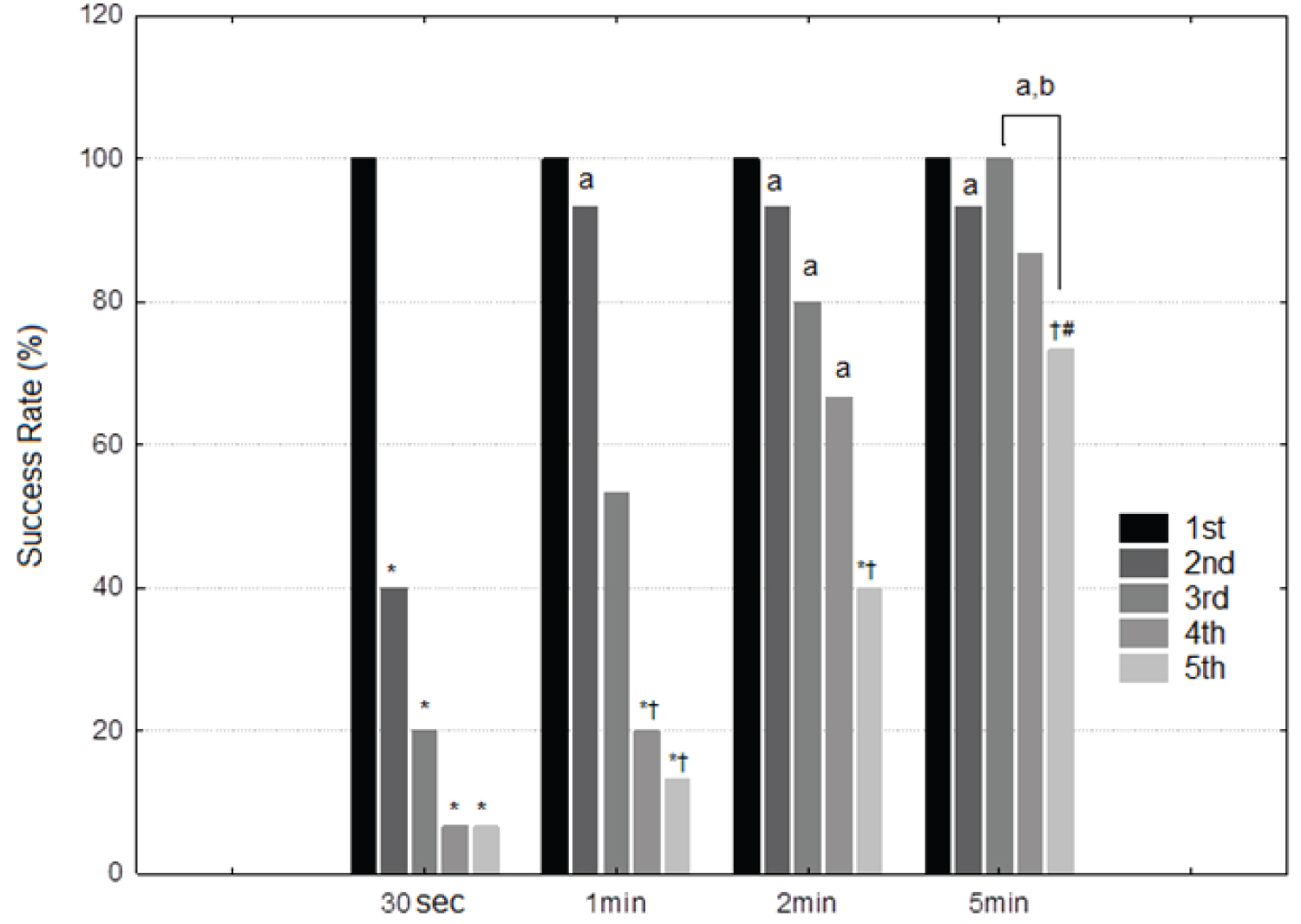 Figure 1: Success rate for multiple 1-RM attempts at different interval conditions in the horizontal barbell bench press exercise.