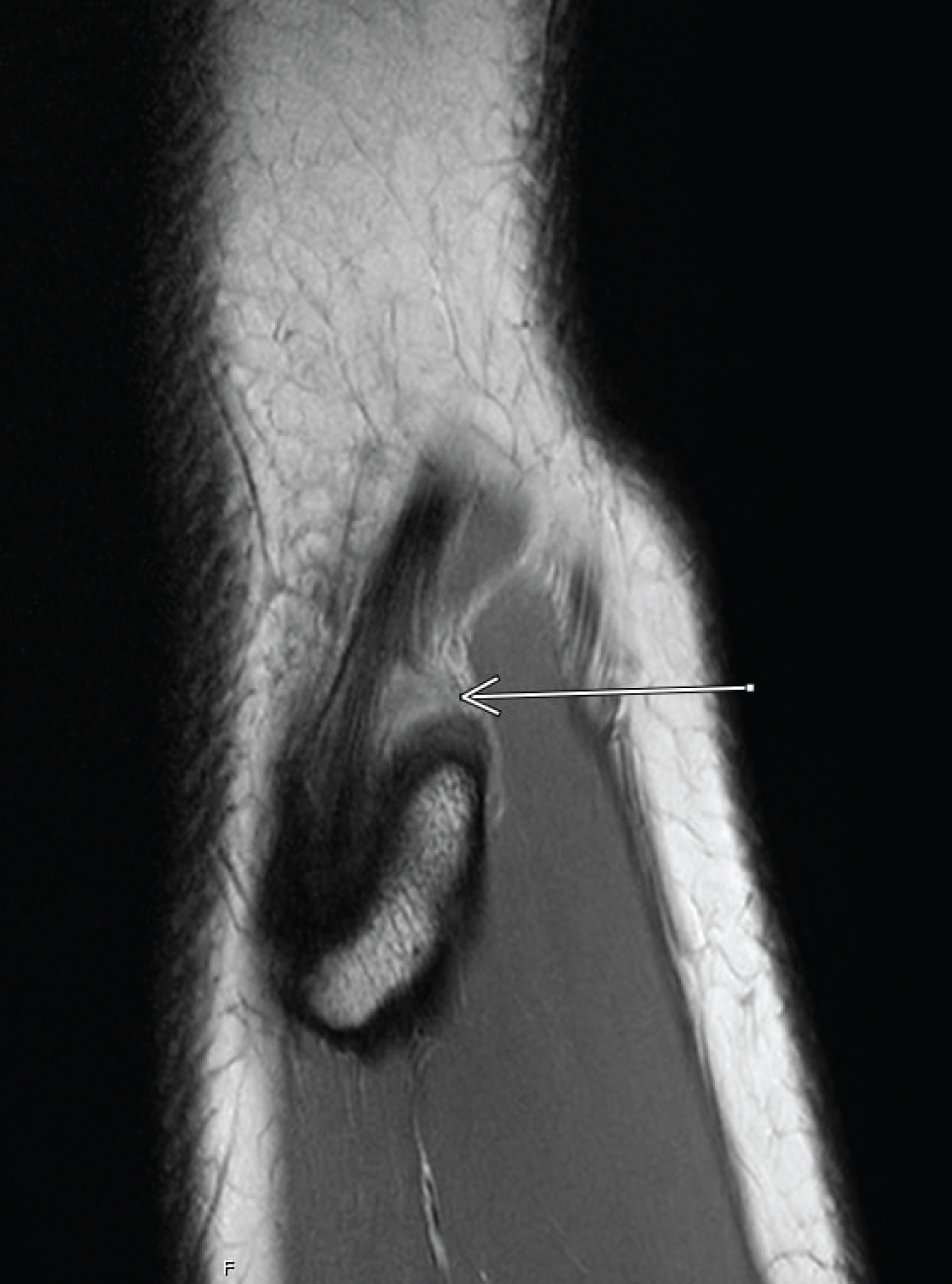 Figure 1: Sagittal PD-weighted SPAIR (SPectral Adiabatic Inversion Recovery) image of partial width tear of the posterior biceps femoris fibular attachment. View Figure 1